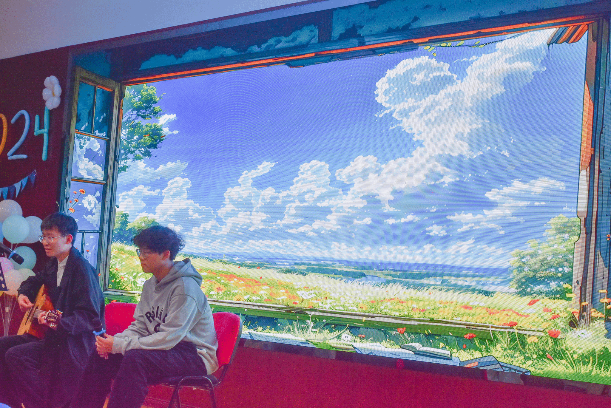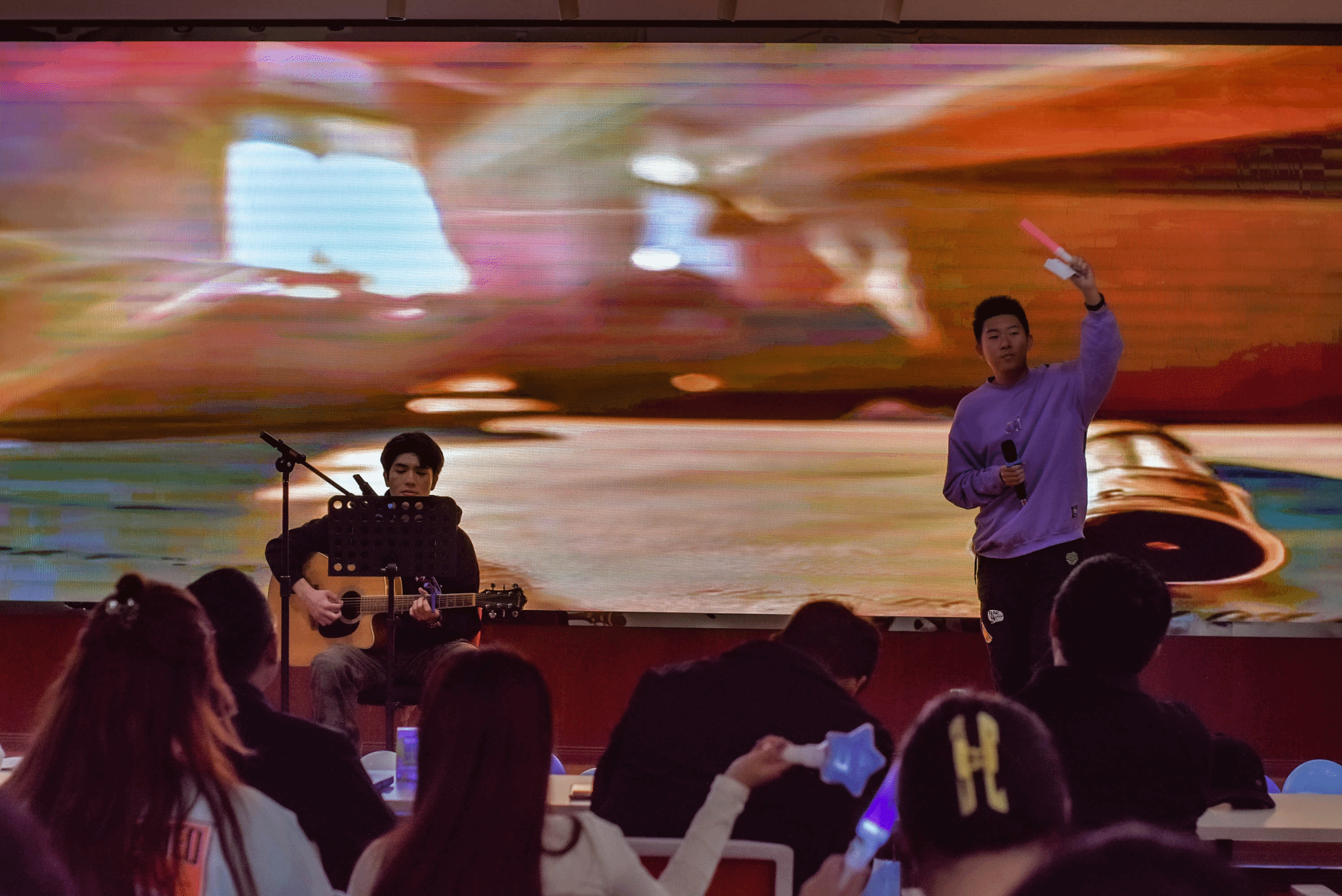 班团建设中心带来的弹唱《慢慢·晴天》让观众们在悠扬的琴声中感受到温暖与宁静,仿佛置身于阳光洒落的美好时光,心灵得到了片刻的放松与愉悦。而生医2024-02班的窦鲲鹏和安比亚·艾克拜尔带来的民谣串烧则以清新的旋律和动人的歌词,唤起了大家对生活的热爱与对未来的期待。