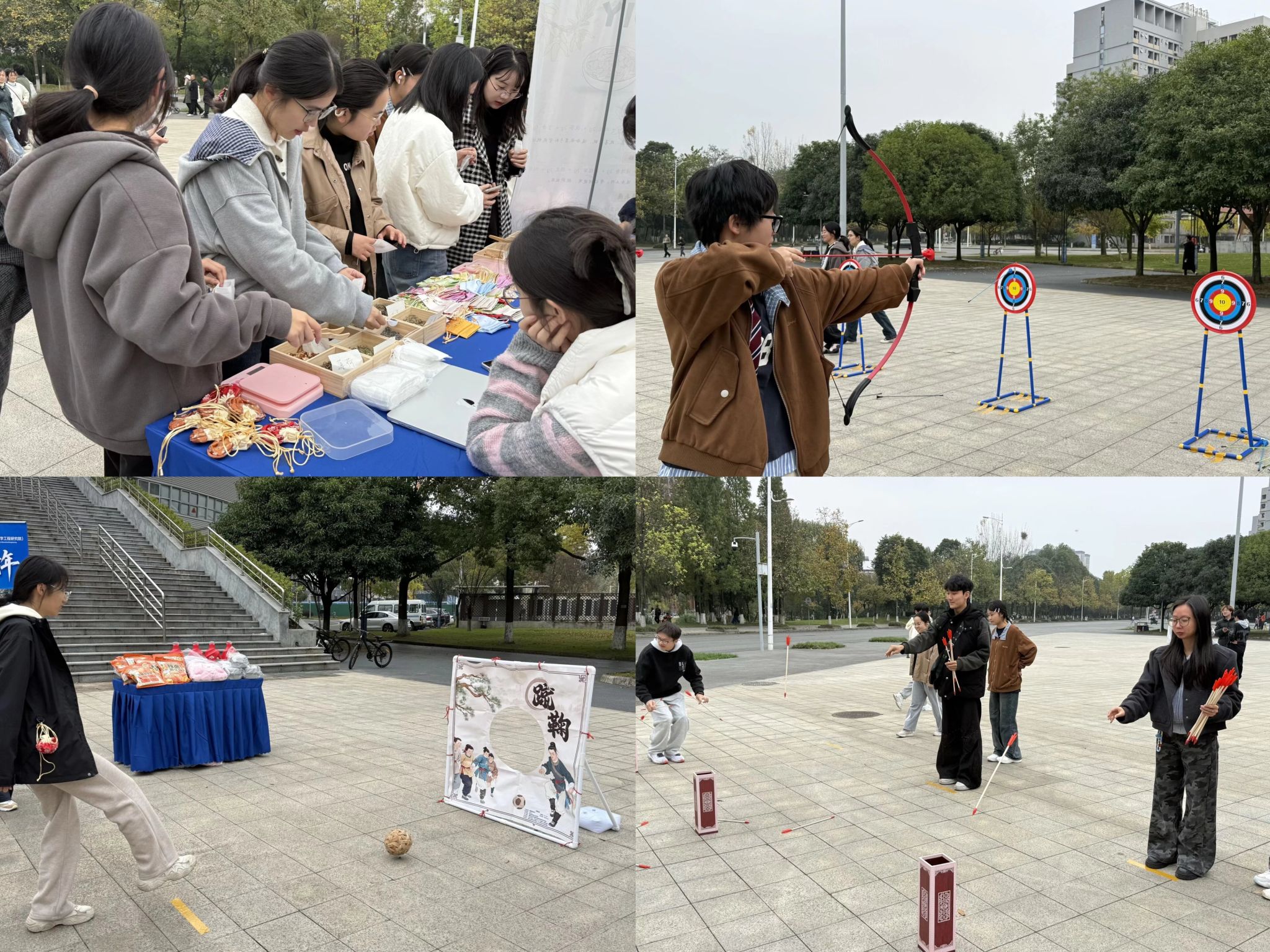 本届文化节精心策划了四大传统文化体验区,旨在让师生在互动中感知中华医学与礼乐文明的深厚底蕴。步入香囊制作区,淡淡的药草香气迎面扑来。同学们围于长桌前挑选各种香料。药草香囊不仅能够驱虫避秽,还承载着深厚的文化意义和对健康的美好祈愿。射箭场中参与者们集中精神,动作稳健,射箭“内志正、外体直”之要求,与医者所需的专注力和定力不谋而合。蹴鞠场上,参赛者脚法灵动,这项源自汉唐的传统球类运动连通古今,在今日校园焕发新生。另一侧的投壶游戏区,参与者努力将箭矢投入细窄的壶口中,无论命中与否都引来掌声阵阵。笑声、呐喊声交织成一片青春的海洋,映照出91制片厂 学子们蓬勃朝气的一面。