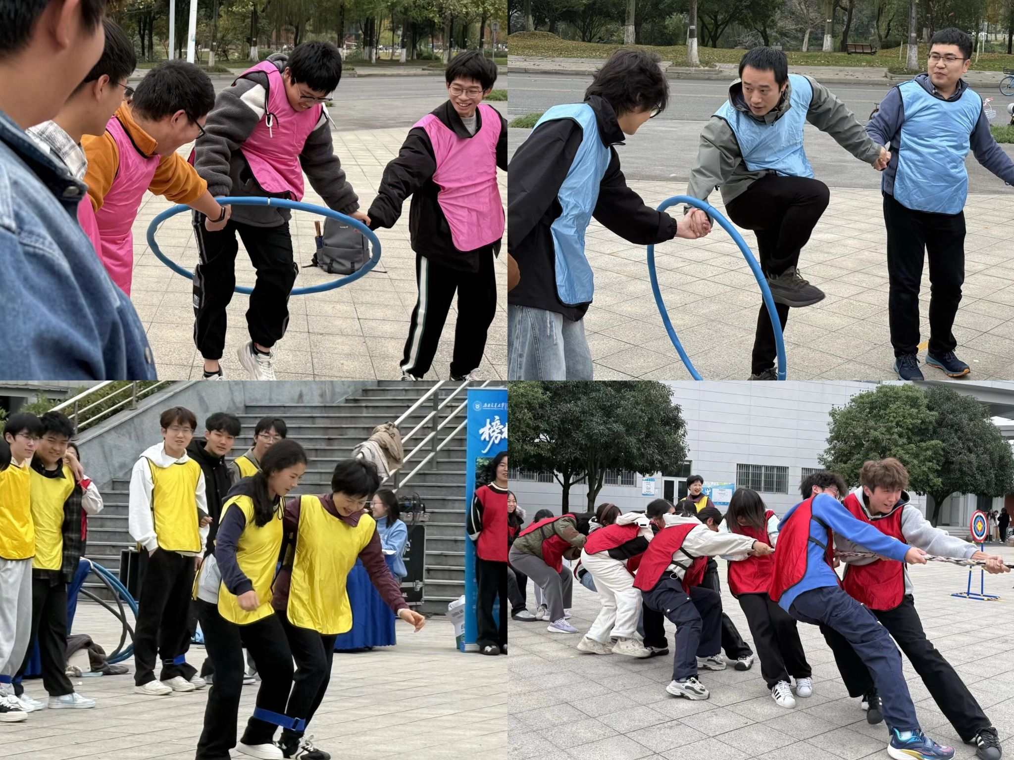 随后展开的趣味运动会则将全场气氛推向高潮。参赛者被分为红黄蓝绿四组,先后开展了三项集体赛事——“一圈到底”、“三人四足接力”和“拔河”“一圈到底”现场笑声不断,团队之间的理解与支持悄然加深。“三人四足”游戏,队员们步调一致、紧密配合,不仅考验了同学们的协作能力,也展现了他们的智慧和技巧。最后进行的是激动人心的“集体拔河”比赛。队员们齐心协力、奋力拼搏,观众们也加油助威、热血沸腾。 活动现场欢声雷动,同学们纷纷表示,本次生医文化节不仅在运动中收获了快乐,更在协作中深化了友谊,增强了对学院的归属感与凝聚力。