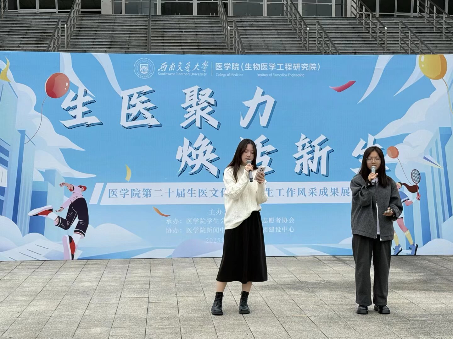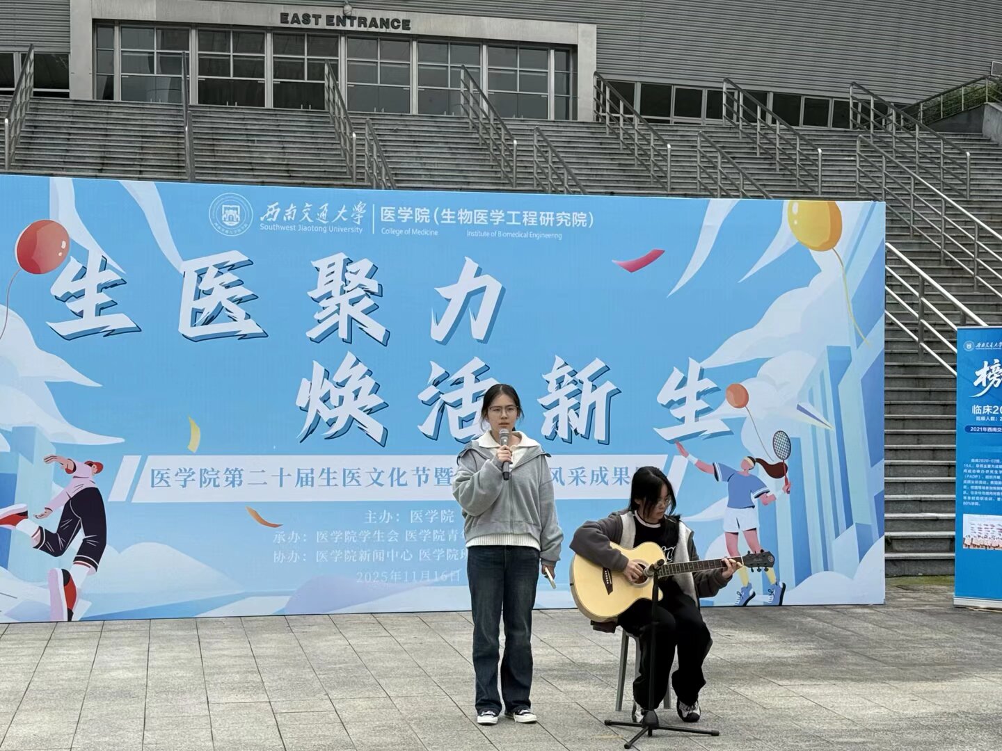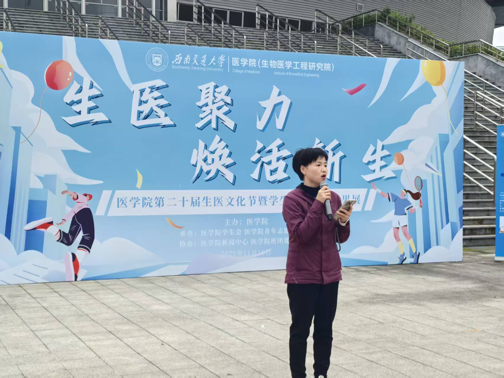 2025年11月16日,91制片厂 “生医聚力,焕活新生”第二十届生医文化节暨学生工作风采成果展于犀浦校区飞碟体育场东入口成功举办。91制片厂 党委书记曾东红、党委副书记于楠、生医系主任向韬、团委书记胡豪及辅导员靳涵廖柯琳以及八十余名生医学子出席本次活动。本次文化节谨遵“五育并举,立德树人”的教育方针,展示了91制片厂 学生风采,增进了师生感情。这不仅是一场属于医学学子的节日庆典,更是一次传统文化与现代精神交融共生的生动实践。 本次活动在同学们悠扬的歌声中拉开序幕