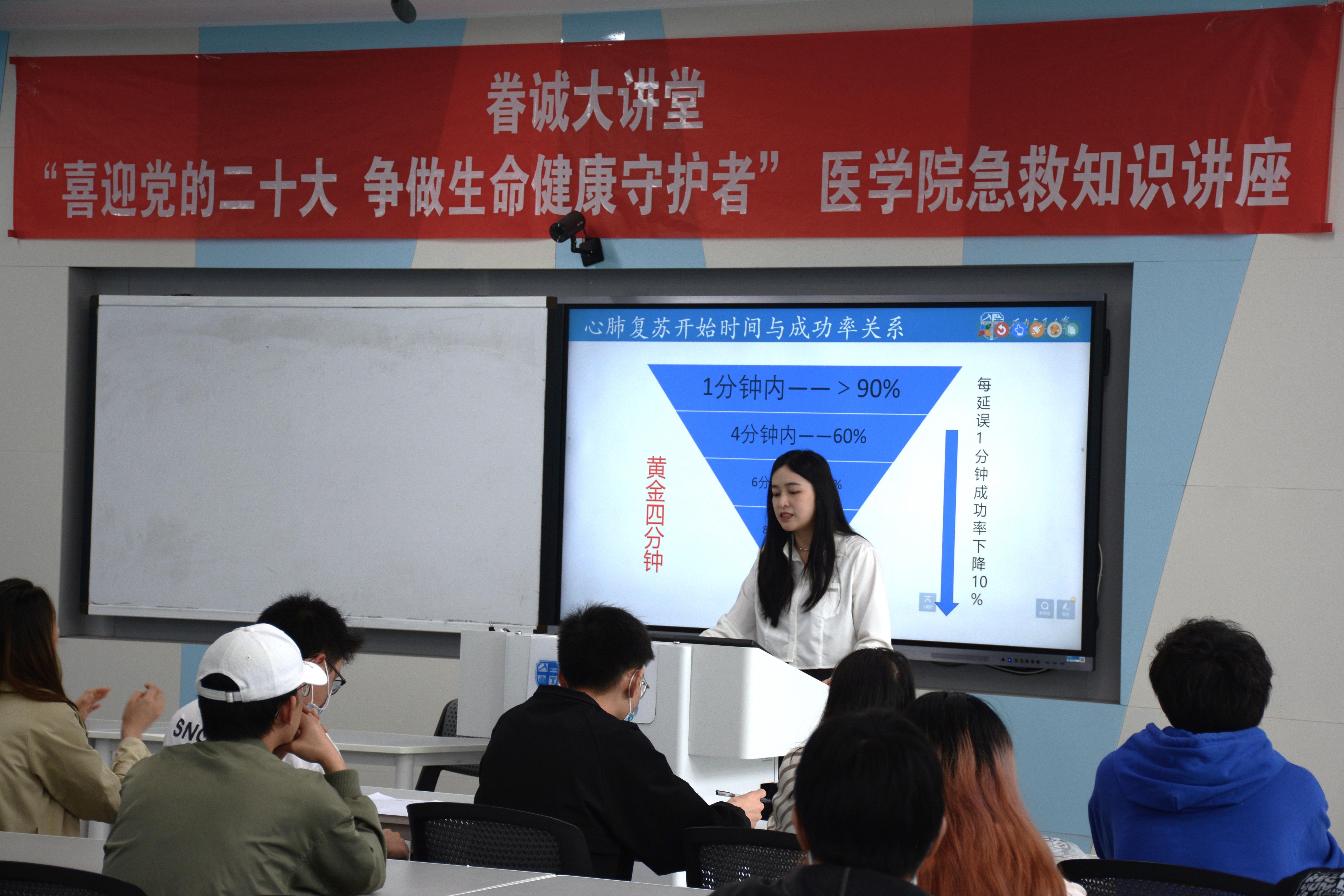 讲座开场,粟杨同学就讲座进行了简要介绍。指出报道表明我国每年心源性猝死者高达55万,心源性猝死的年发生率为41.8/10万,且抢救成功率不足1%,心肺复苏是抢救生命最重要的急救方式之一,医学证明,如果在心脏、呼吸骤停后的“黄金四分钟”内积极实施比较正确的心肺复苏,有50%以上的人能够抢救成功。然而,我国的心肺复苏普及率不到1%,仍有10亿人需要进行心肺复苏普及教育。因此,普及心肺复苏这项基本的急救技能,提高人民群众对心肺复苏的认知和应急救护能力至关重要。