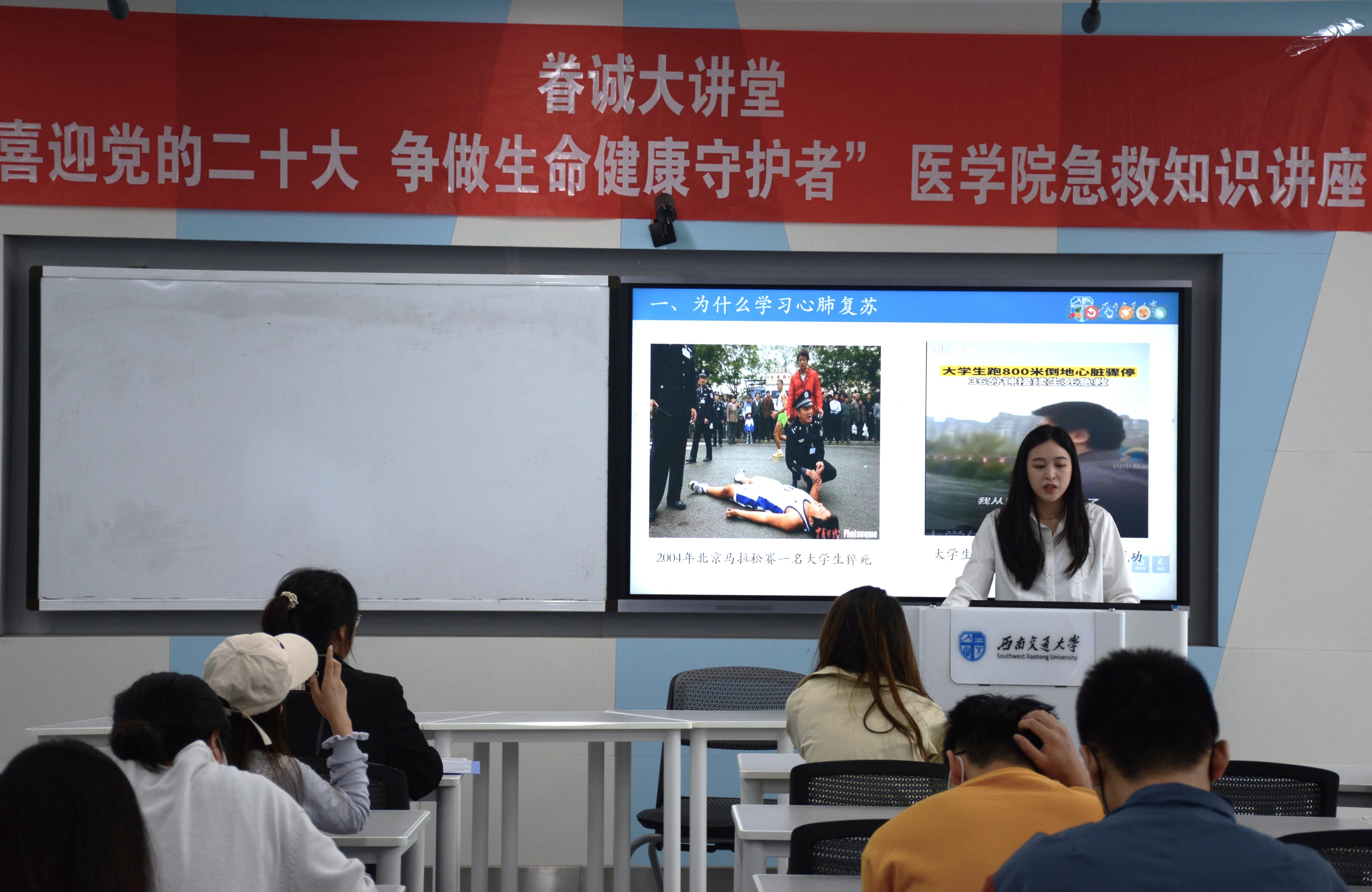 随后,晏唯同学通过图文并茂的PPT,结合自身作为医学生的实践经验,就“为什么学习心肺复苏”、“什么是心肺复苏”以及“怎样进行心肺复苏”三个方面进行了专业、风趣的理论讲述。学习心肺复苏是基于现实的需要,一方面,不到1%的心肺复苏普及率无法应对多发、频发的心跳呼吸骤停事故;另一方面,全球最快的120急救反应时间也长于心肺复苏抢救的”黄金四分钟“,这就要求我们尽可能的进行现场的、及时的心肺复苏。