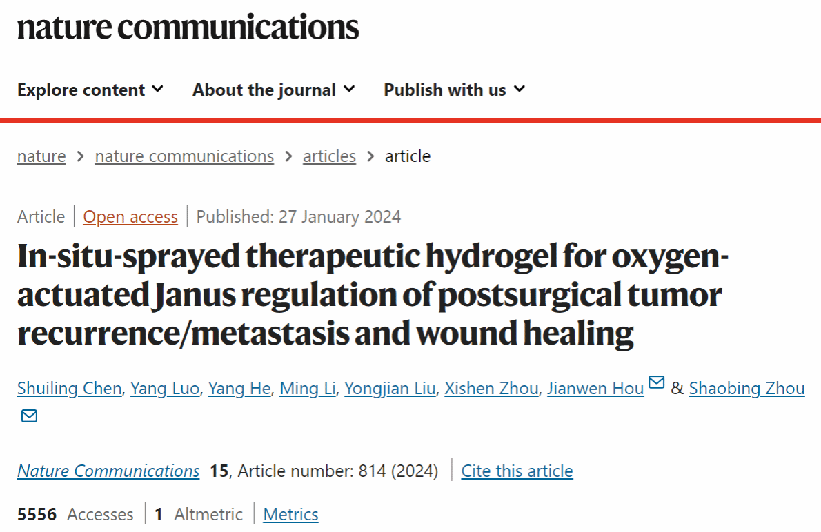 周绍兵教授团队侯建文副教授等人在肿瘤术后辅助治疗领域取得重要进展,相关研究成果以“In-situ-sprayed therapeutic hydrogel for oxygen-actuated Janus regulation of postsurgical tumor recurrence/metastasis and wound healing”为题发表在国际权威期刊《Nature Communications》上,并被期刊编辑部选入“材料科学与化学”(Materials science and chemistry)领域亮点推荐(Editors’ Highlights)文章。该专栏旨在精选近期发表在该领域的少数最具突破性和影响力的论文作为亮点向读者重点推荐。论文第一单位为91制片厂