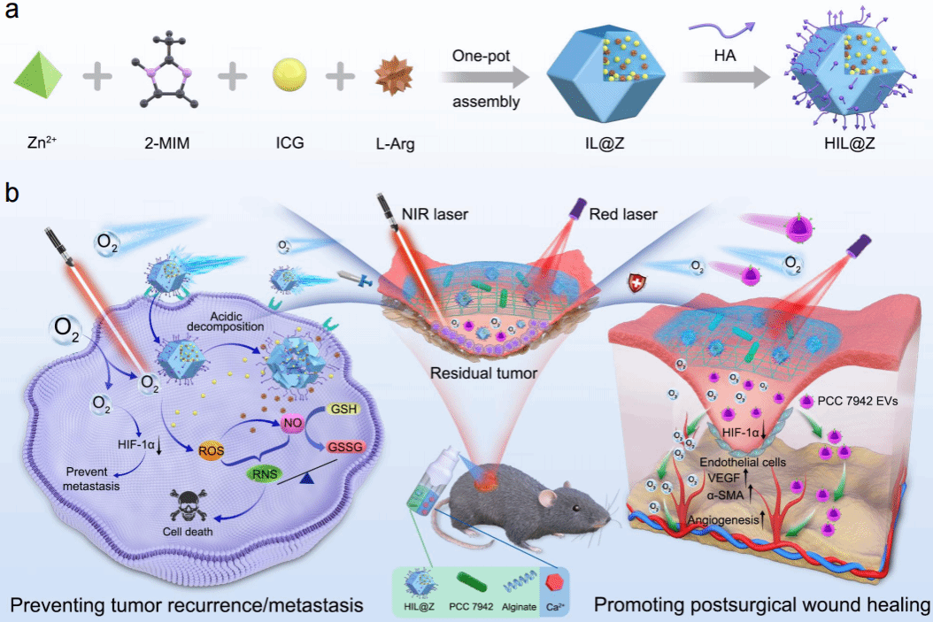 图1自产氧活性水凝胶对黑色素瘤术后的防复发转移和促伤口愈合作用示意图