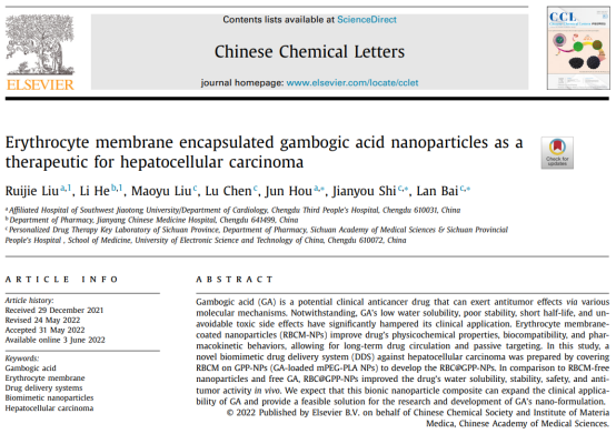 研究生导师侯君团队在中国化学会主办、中国医学科学院药物研究所承办的中科院Q1区SCI刊物Chinese Chemical Letters(IF:8.455)发表题为“Erythrocyte membrane encapsulated gambogic acid nanoparticles as a therapeutic for hepatocellular carcinoma”的研究。