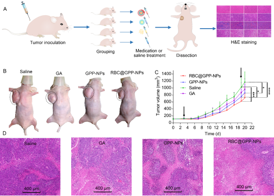 仿生纳米制剂的稳定性强于无膜纳米,且其缓释性能好,在肿瘤生长酸性环境中释放度高于无膜纳米制剂。研究结果如图2A所示,在第6天,RBC@GPP-NPs的平均粒径从98.35 nm增加到100.06 nm,增加量为1.71 nm, GPP-NPs的平均粒径从85.01 nm增加到89.7 nm,增加量为4.69 nm,这表明两种制剂在6天内都是稳定的,但仿生纳米制剂表现更好。16天后,两者的增量均小于7 nm。此外,两组PDI值在第6天后趋近于0.15,表明两种制剂均具有良好的分散性。在中性PBS(pH 7.4)中(图2B),RBC@GPP-NPs的GA最大累积释放率约为36.62%,低于GPP-NPs的41.44%。而在酸性介质(pH 5.5)中(图3C),RBC@GPP-NPs的GA最大累积释放率增加到53.25%,仍低于GPP-NPs的药物累积释放度(62.96%)。这些结果表明,仿生纳米制剂具有保持体内有效药物浓度的潜力。