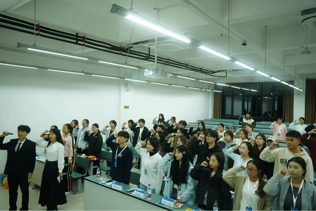 大会尾声,授牌仪式正式举行。指导老师为新任会长们授予工作牌,部长们为新成员颁发部门工作牌,这份荣誉承载着责任与使命。随后,全体成员起立,举起右拳庄严宣誓,“尽己所能,不计报酬,帮助他人,服务社会……”铿锵有力的誓言回荡在现场,彰显了大家践行志愿精神、传递志愿温度的坚定决心。