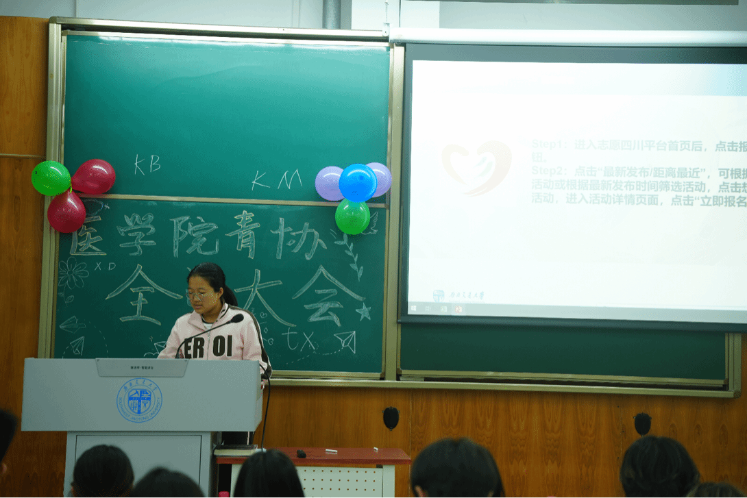 随后,青协负责人详细介绍了协会三大核心志愿项目。“三下乡”社会实践项目聚焦基层需求,组织志愿者深入实践,用专业知识助力乡村振兴;“志愿四川”星级志愿者评定机制为志愿者搭建了规范化成长平台,以星级认证激励大家积累志愿时长、提升服务质量;“交通工艺”特色志愿项目则融合校园与社会场景,开展交通文明引导、传统工艺推广等多元化活动,让志愿服务更具创新性与影响力。项目介绍让新成员们全面了解了协会的服务范畴与核心价值,激发了参与热情。